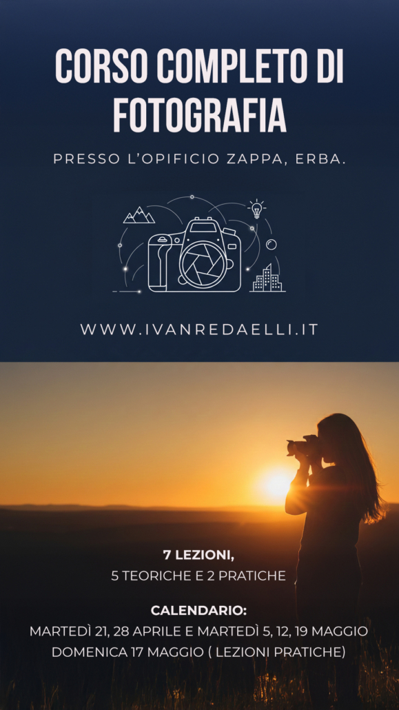 Importante, per usufruire al meglio di tutti i contenuti pratici e teorici del corso è consigliato avere una fotocamera reflex o mirrorless (consigliate), oppure compatta con possibilità di controllo manuale dell’esposizione.